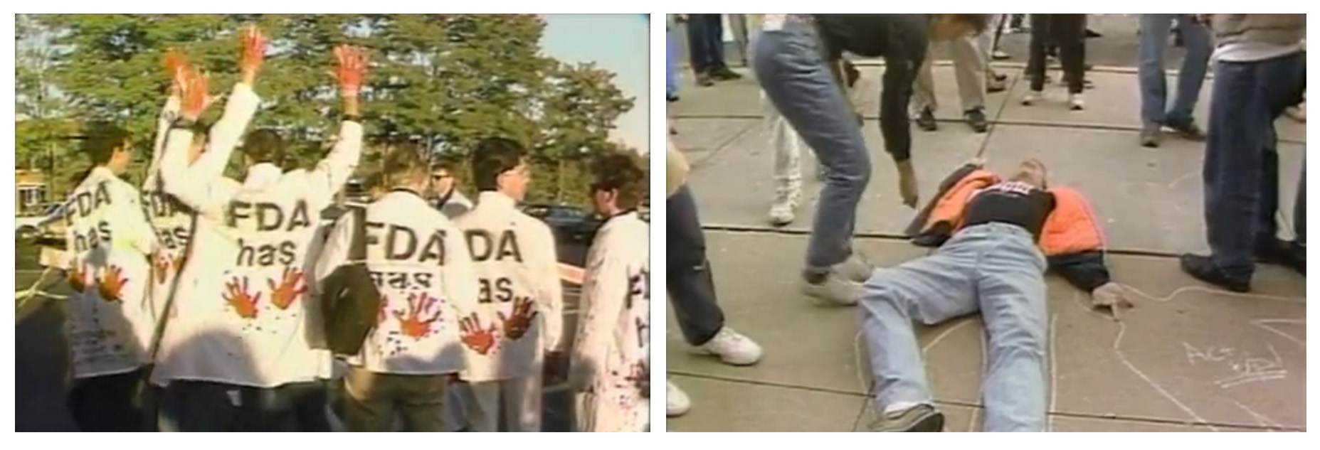 Although activism had been growing since the early 1980s, coverage of activist demonstrations increased significantly in 1989. The AIDS Coalition to Unleash Power (ACT UP), the most prominent AIDS activist group, was founded in 1987. ACT UP engaged in direct action, meaning that its protests creatively represented particular issues faced by people with AIDS and provided specific solutions to those problems. Direct action was also a strategy used during the Black Civil Rights Movement; similar to sit-ins, ACT UP’s die-ins involved the dramatized performance of a problem and demonstrated viable solutions. Sarah Schulman, a journalist and author who was involved in ACT UP during this period, wrote,