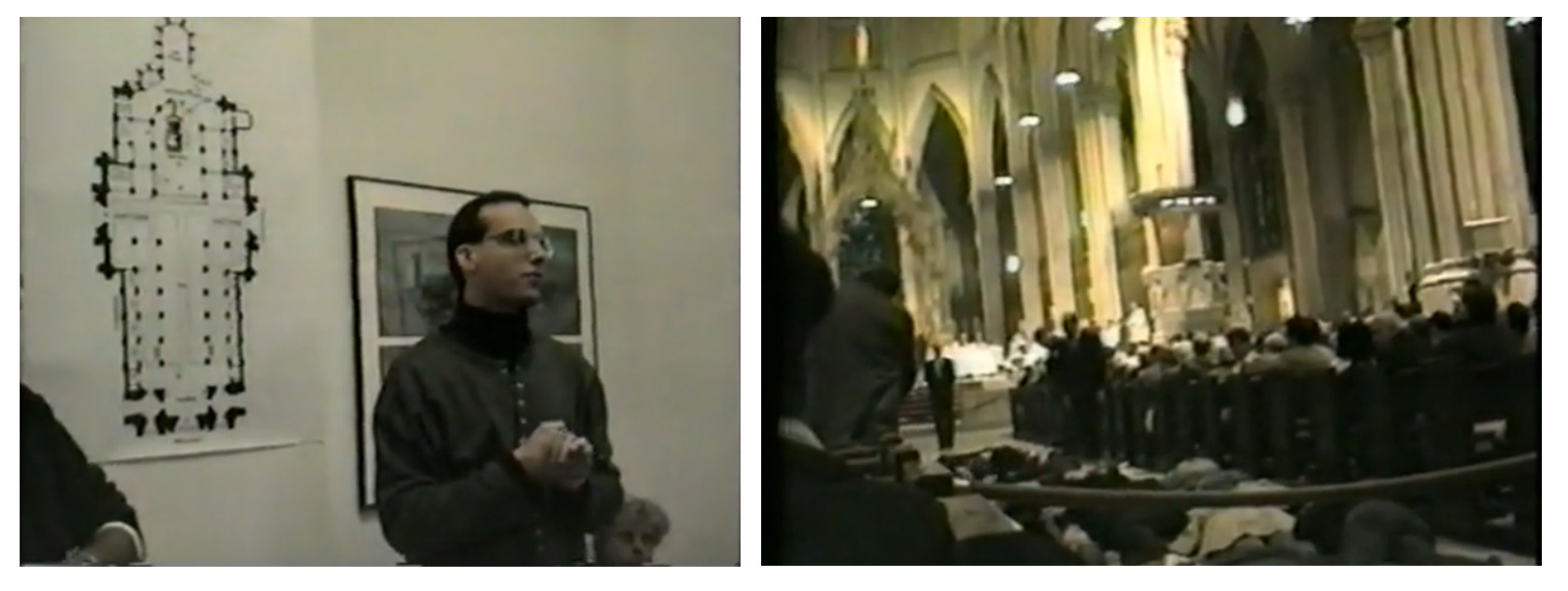 Writer and activist Robert Hilferty’s footage from the planning of the protest offers an intimate look into the functioning of ACT UP. Hilferty, who became involved in ACT UP in 1987, used a Hi-8 camera to record the planning and execution of the protest.75 The Hi-8 was a new, handheld camera available in 1989 that recorded onto 8mm video tapes, and its portability allowed Hilferty to document activists up-close and in the moment. Hilferty filmed as members debated the ethics of disrupting a church service, and both Catholics and non-Catholics involved in the action aired their criticisms of O’Connor and the Catholic Church at an organizing meeting. Using footage from ACT UP meetings and from the protest itself, Hilferty created a documentary called Stop the Church.